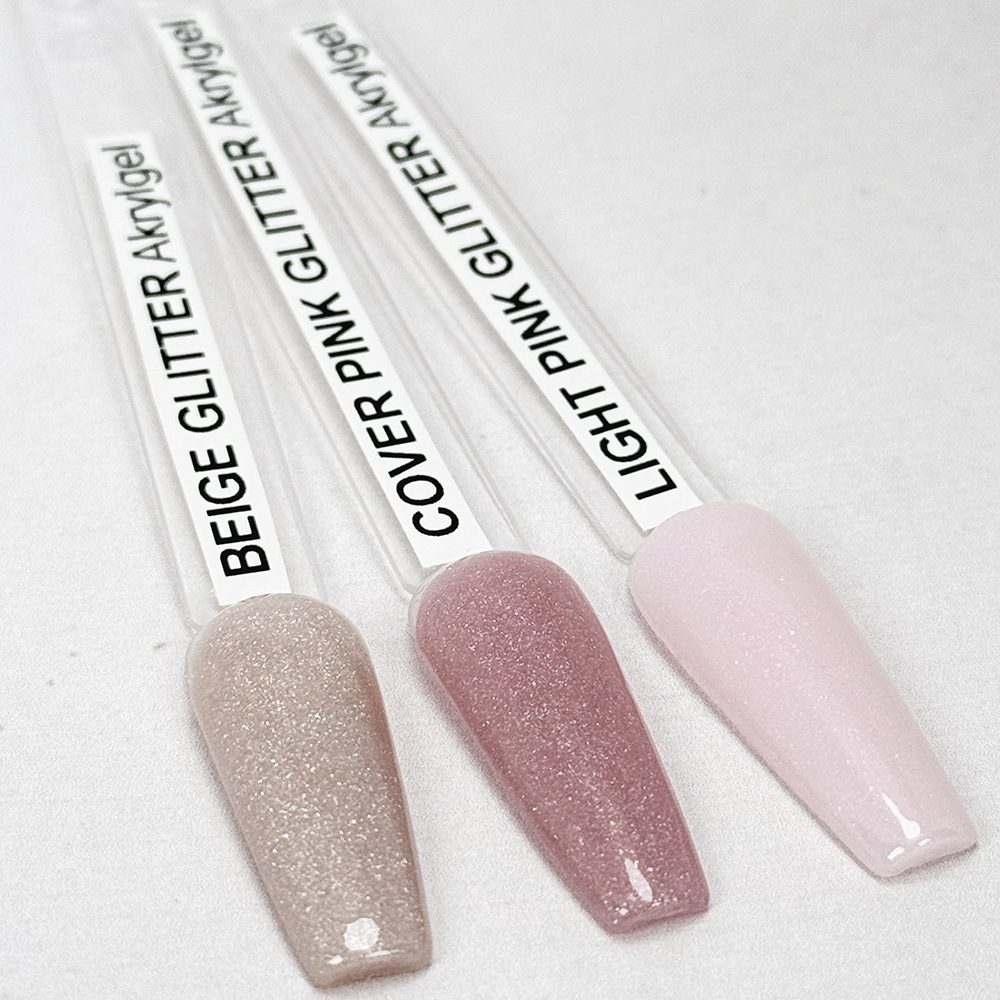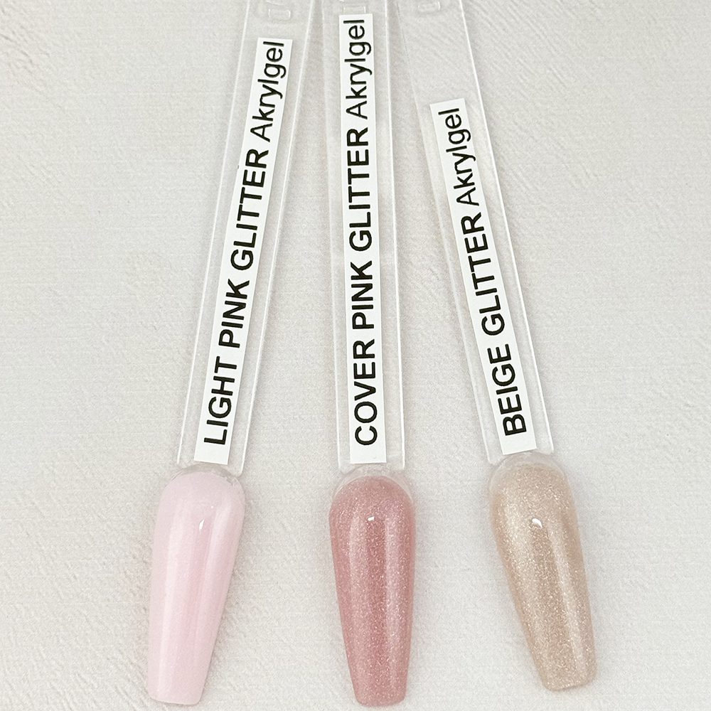Akrylgel BEIGE GLITTER kombinerar akrylens styrka med gelens flexibilitet och har en mjuk, ljus beige-basis med subtila glittrande pigment. Resultatet är en sofistikerad, naturligt varm nude-ton med ett elegant skimmer — perfekt för kunder som vill ha en diskret men lyxig glitternude.