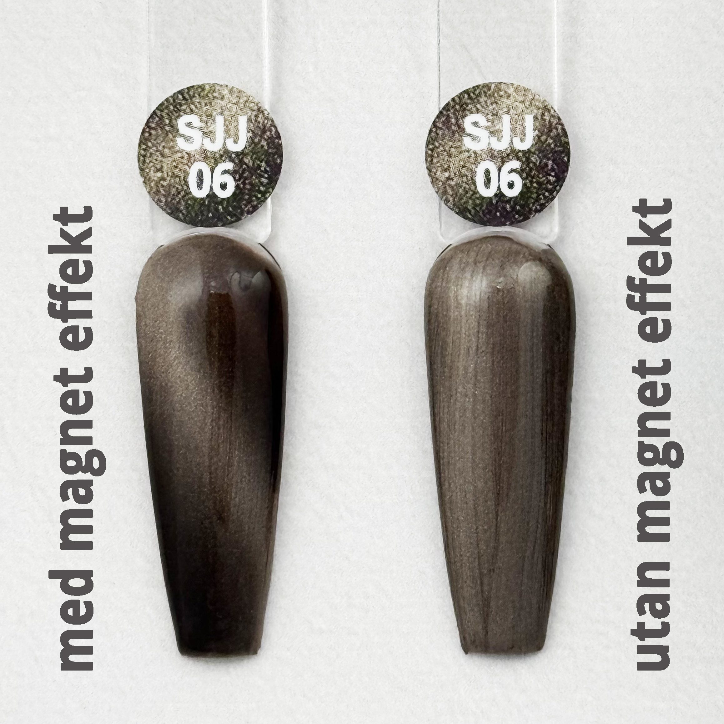 Formulan är utvecklad för dig som vill ha en professionell, följsam och lättkontrollerad konsistens. Den flyter mjukt över nageln utan att rinna, och glittret fördelas jämnt för att skapa den där rika, sammetslika känslan som gör denna nyans så speciell. Den magnetiserade effekten ger ett subtilt djup som rör sig med ljuset, medan den omagnetiserade varianten bjuder på en mjuk brun skimmerfinish som är lika vacker i sin enkelhet.